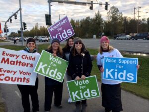 - Statewide, thread stands with signs for Vote for Kids.